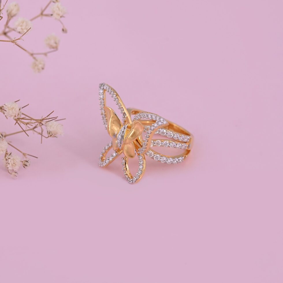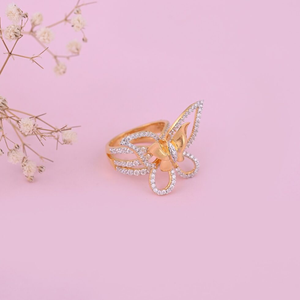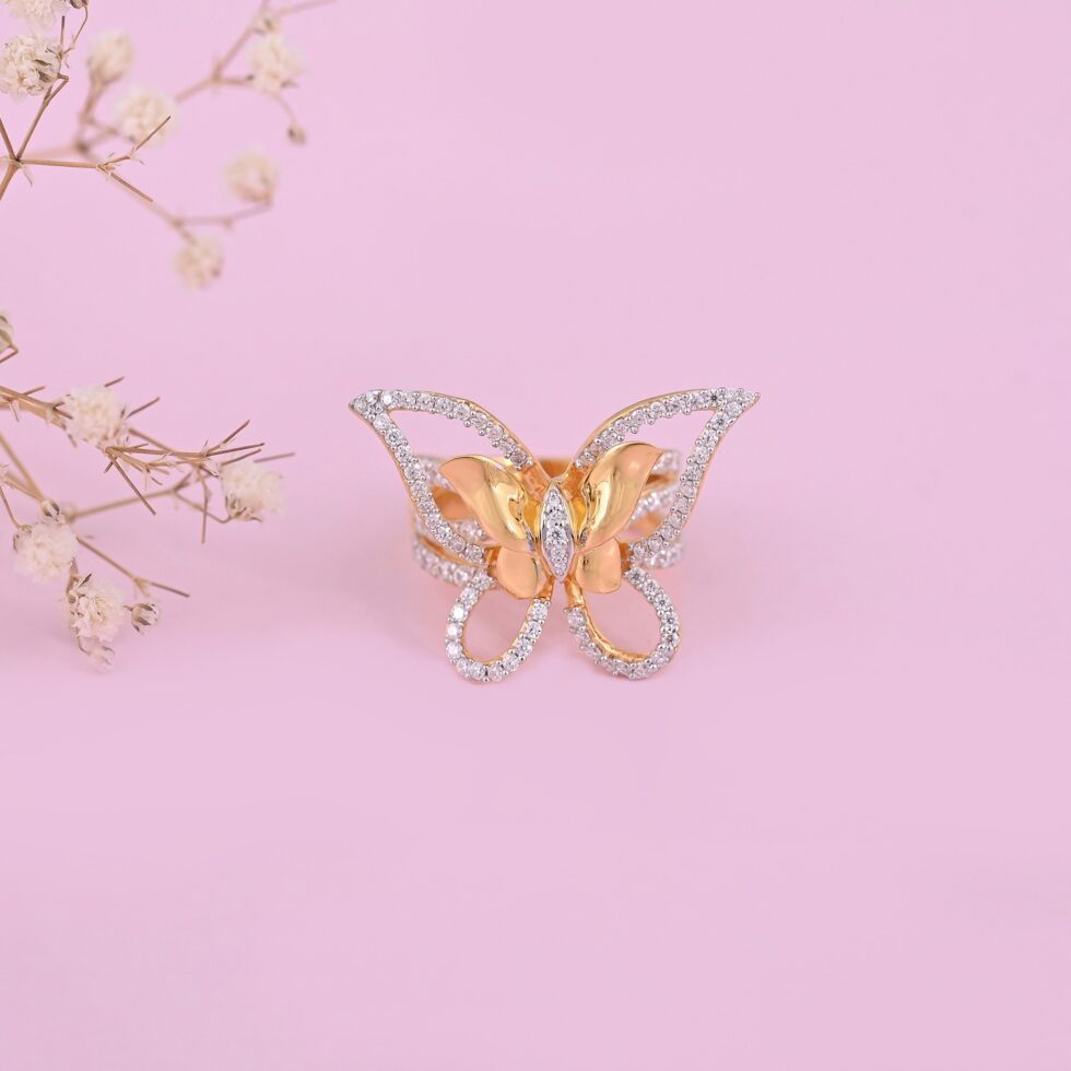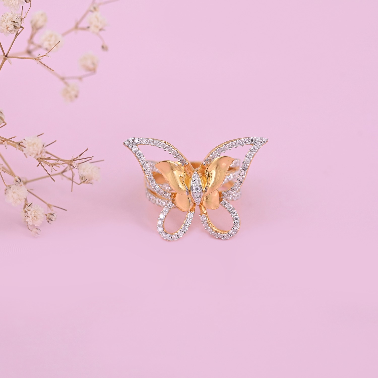 This beautiful butterfly ring includes semi enclosed butterfly wings that are studded with moissanite stones on and around it.