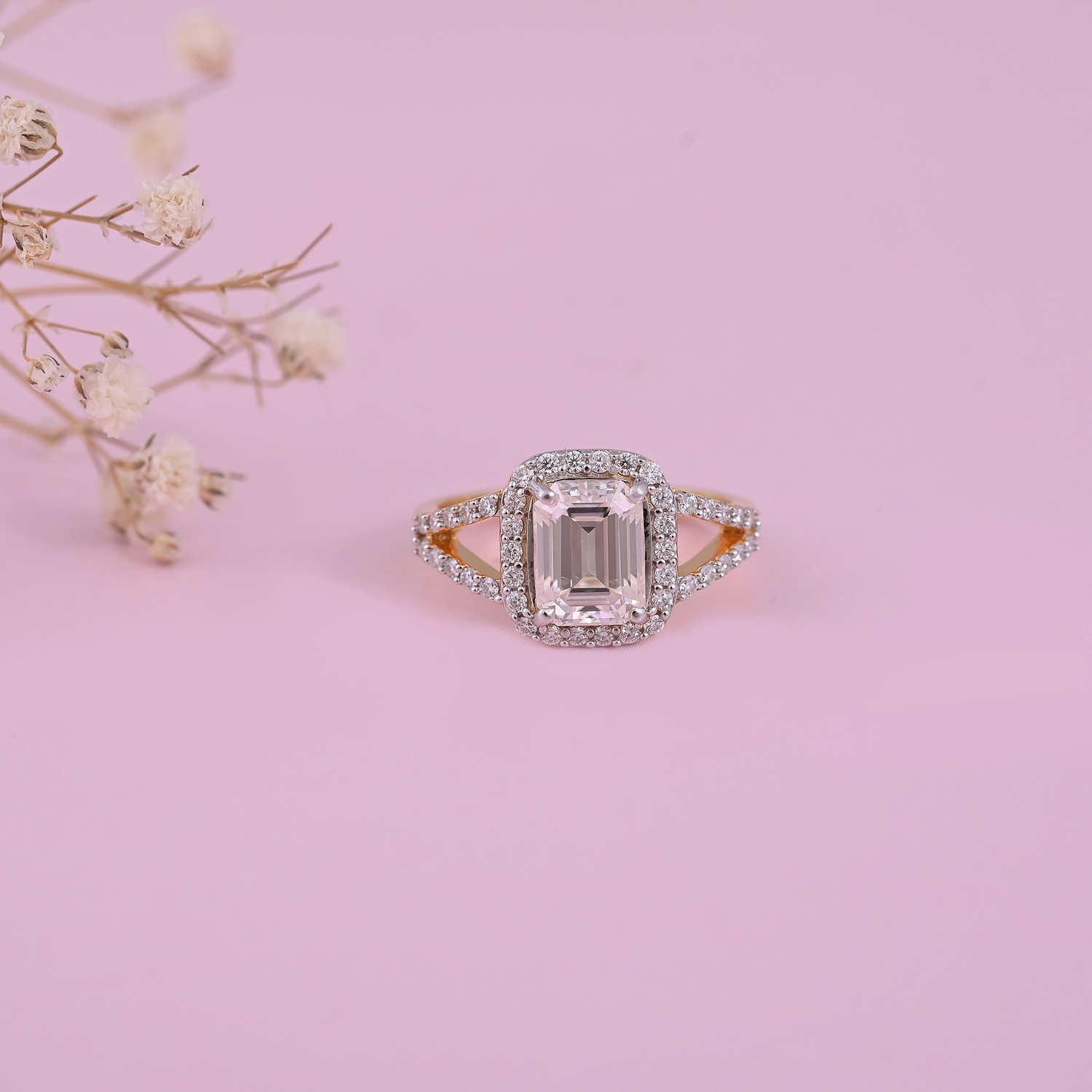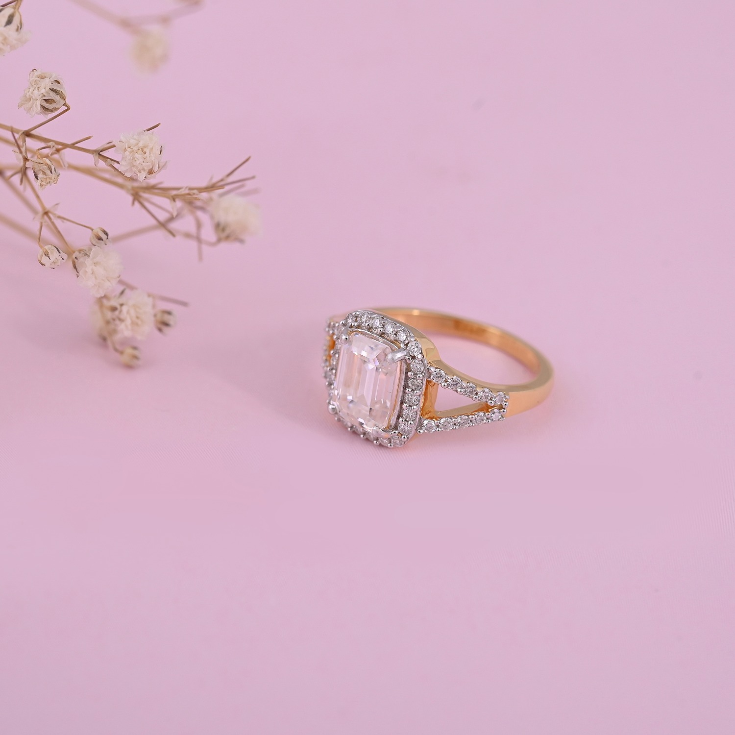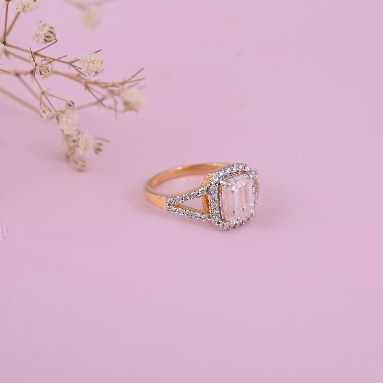 This ring features a Emerald-Cut moissanite placed at the center set with additional moissanites along the band making it a versatile choice.
