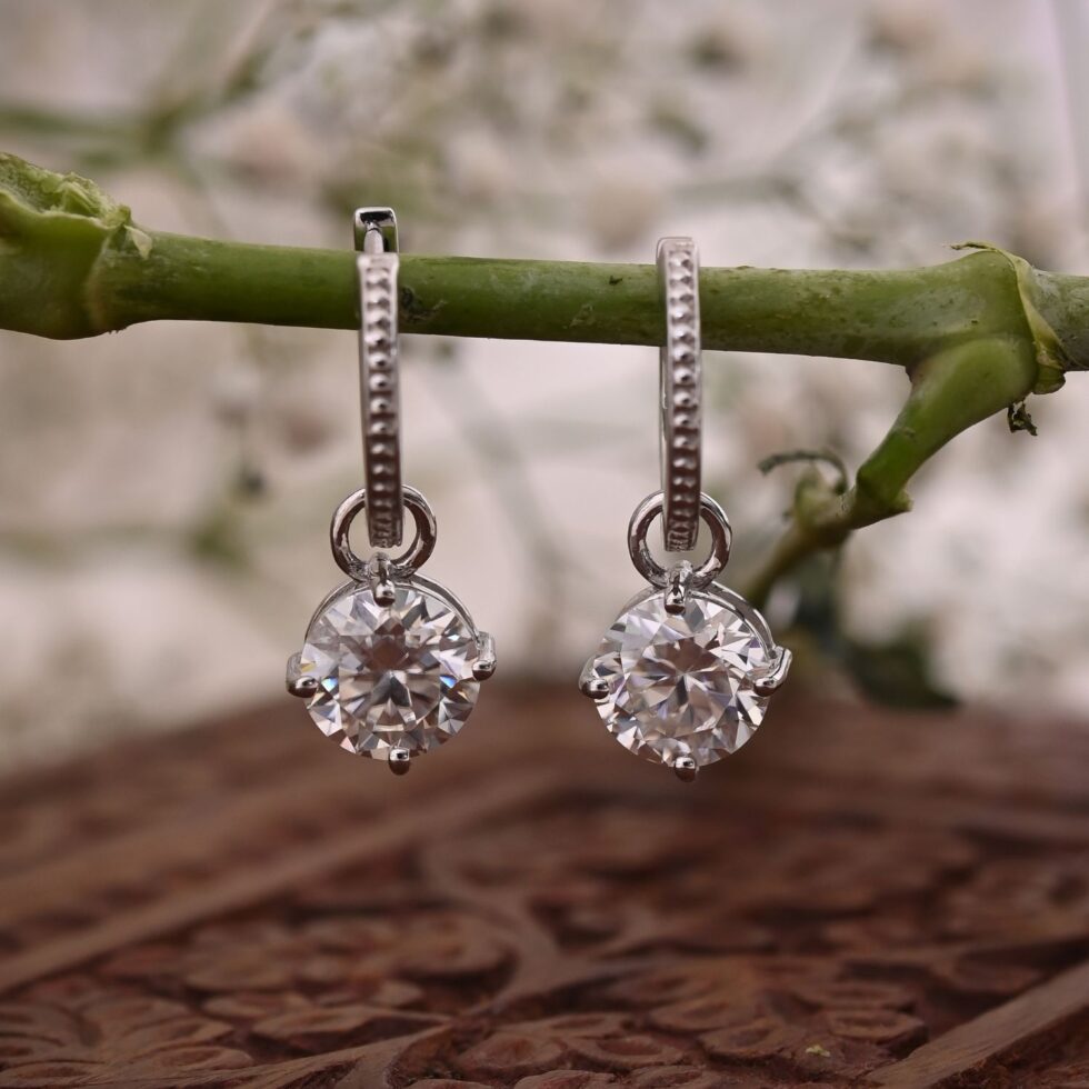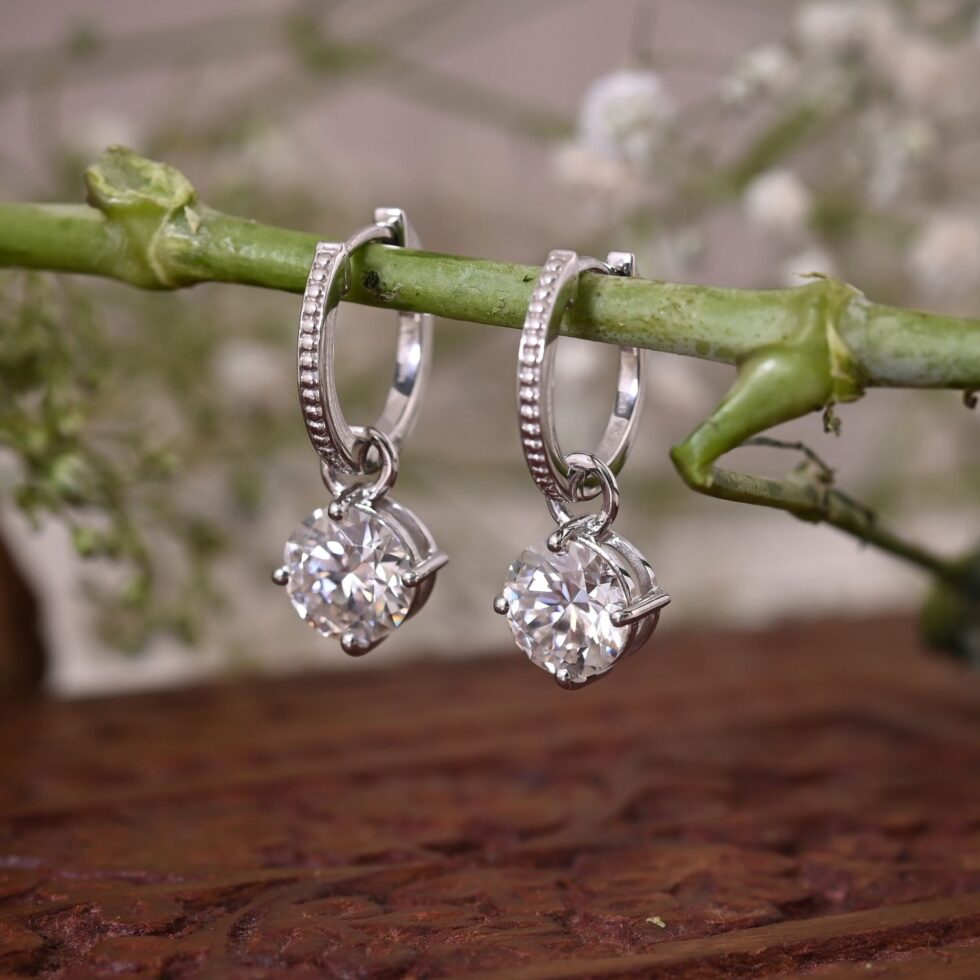 This earring are beautifully handcrafted with love for you. It has a round cut moissanite hanging on it, which will give you the look a hoop earring.