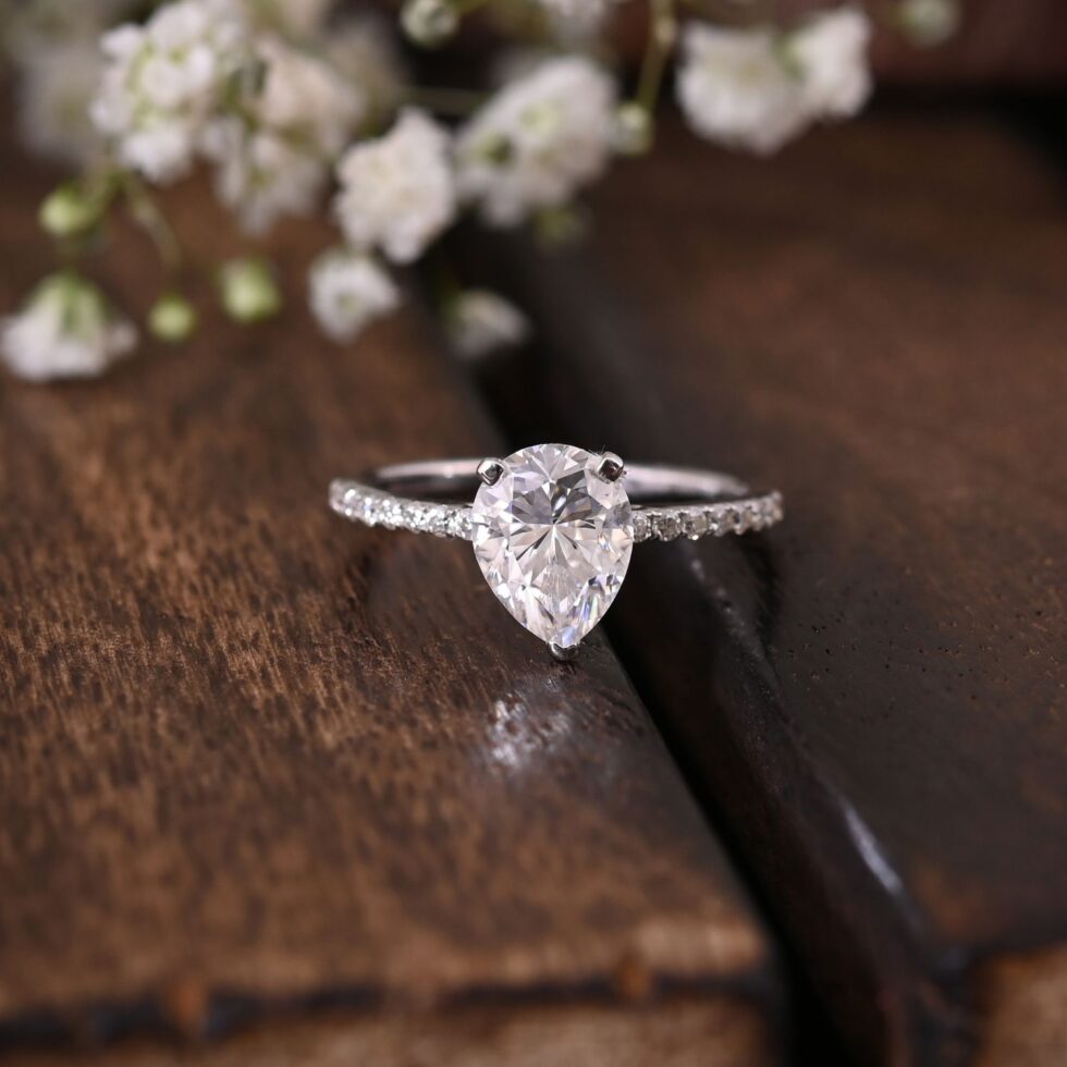 It’s a perfect solitaire ring studded with pear cut moissanite at the center.