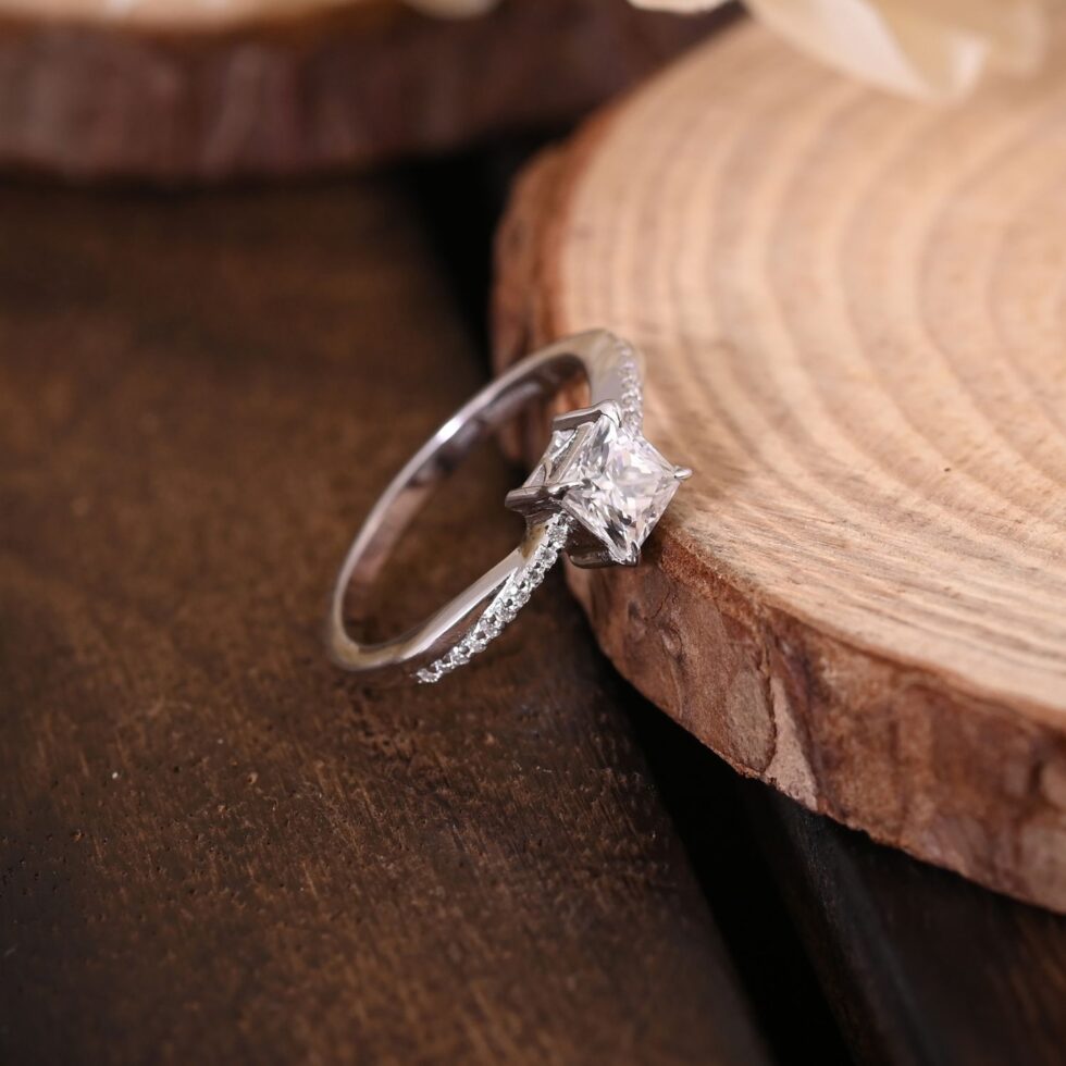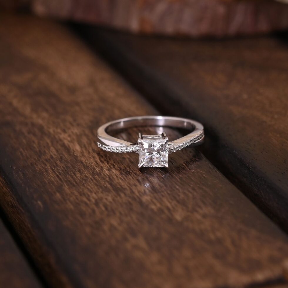 This is a perfect princess cut engagement ring for your special one studded with dazzling moissanites.